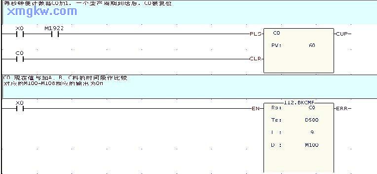 ? 所謂絕對凸輪控制,是指計數(shù)器 C現(xiàn)在值在設(shè)置的一段絕對時間段內(nèi),對應(yīng)輸出裝置會 ON,多個 M 裝置可能同時為 ON。本例中, C0現(xiàn)在值與 9段設(shè)置絕對時間段( D500~D517)進行比較,在這些設(shè)置時間段內(nèi),對應(yīng)的 M100~M108 中的裝置狀態(tài)輸出為 ON。 z在BKCMP指令被執(zhí)行前,也可用 MOV指令預(yù)先將各設(shè)置值寫入到 D500~D517中。C0當前值所屬范圍 | 輸出裝置 |