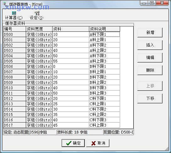 【控制程序】首先將各種原料加入的下限、上限時間設(shè)定在緩存器表格中,如下圖: